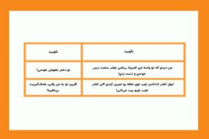 شما میتوانید این باور را در فرزندتان شکل دهید که هر کسی استعدادهای متفاوتی دارد. به طور مثال بهتر است وقتی کودک توانمندی یا استعداد خاصی در خواهر یا برادر بزرگترش مشاهده میکند، علاوه بر تحسین آن شخص، توانمندیهای خودش را یادآور شویم. برای مثال اگر میگوید که نمیتواند مانند برادر بزرگترش شوتهای بلند بزند، به او بگوییم: «بله برادرت خوب شوت میزنه اما من متوجه شدم که تو میتوانی خیلی سریع بدوی و توپ رو از میان مدافعین رد کنی». این نوع تشویق کودکان علاوه بر اینکه بر عملکرد کودک تاثیر میگذارد باعث افزایش اعتماد به نفس او نیز میشود. در جدول زیر چند نمونه از تشویق صحیح کودکان آورده شده است.